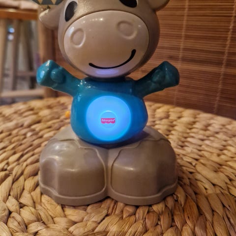 Hyvä kuntoinen. Pitää ääntä, vatsaan tulee valo ja heiluttaa päätään.