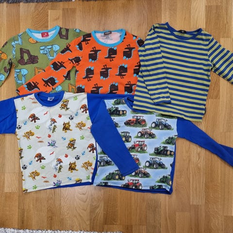 Vaatteet ovat siistejä, yhdessä t-paidassa (oikeanpuolimmainen) pieni tahra, ei kauheasti näy.