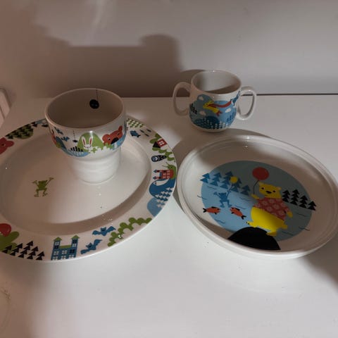 Arabian Lysti lasten astiasto. Settiin kuuluu kaksi lautasta ja muki. Toinen lautasista ostettu settiin myöhemmin. Posliinia. Kestää konepesun. Paljon käytettyjä, edelleen ehjiä ja siistejä. Lautasten kuvissa nähtävissä pientä naarmua.