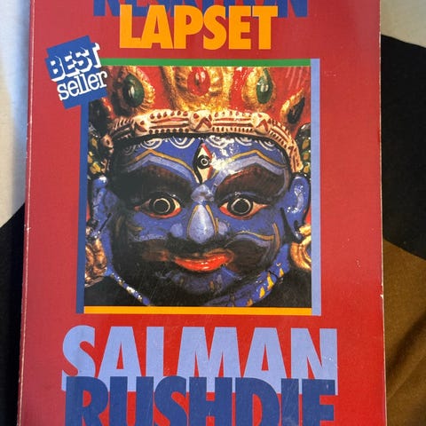 Salman Rushdie Keskiyön lapset, kovakantinen, WSOY, s. 570. Ex Libris merkintä sisäsivulla, iän tuomaa kellastumista sivuilla
