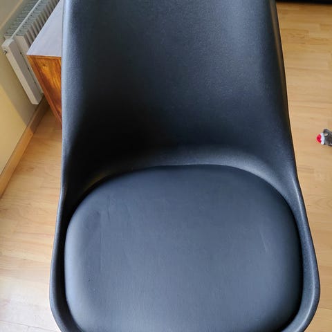 Tuolissa vaalean ruskea kangasverhoilu, puujalat. Istuinkorkeus 46 cm, siistikuntoinen.