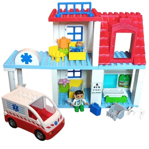 Lego Duplo sairaala/klinikka, 4 ihmishahmoa, ambulanssi, kalusteita ja muita tarvikkeita.
