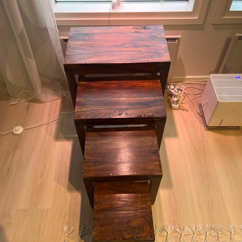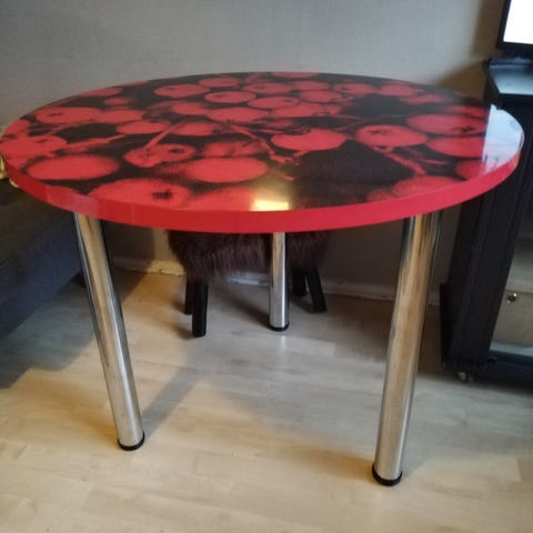 Apupöytä/tarjoilupöytä koivunvärinen, joka joskus petsattu vaalealla. Petsaus osittain kulunut pois. Saa kivan hiomalla tai uudelleen maalaamalla. Sisältää kaksi laatikkoa. Mukaan saa Marimekon verhokankaat eteen.