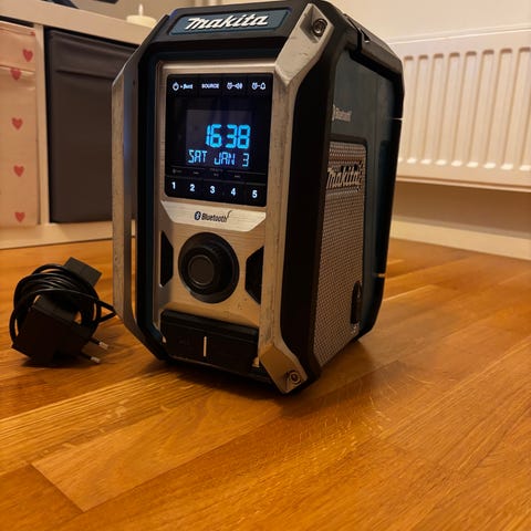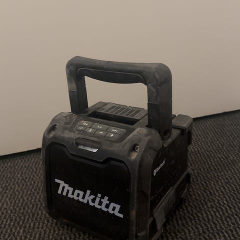 Kyseessä on Makita BMR100 -työmaaradio, joka tunnetaan kestävästä rakenteestaan ja monipuolisista virtalähteistään.