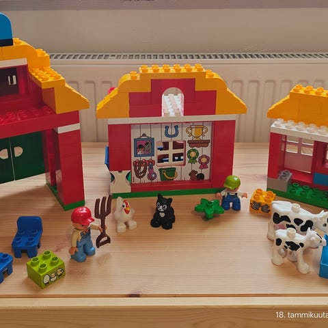 Lego Duplo maatila, 10 eläintä, 3 ihmishahmoa, traktori maitosäiliöllä.