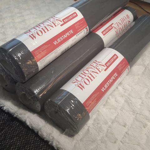 Neljä uutta rullaa pakkauksessaan, sekä yksi puoliksi käytetty rulla tapettia.