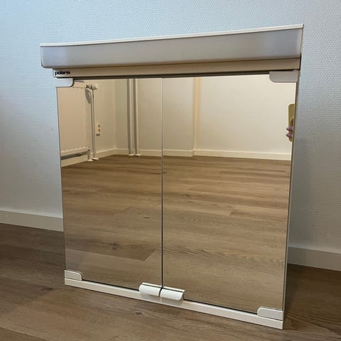 Valkoinen Polarian peilikaappi, jossa on peiliovet ja sisäiset hyllyt. Varustettu LED-valolla yläosassa. Sopii kylpyhuonekäyttöön ja tarjoaa säilytystilaa hygieniatuotteille ja tarvikkeille. Ovissa peilit molemmin puolin.