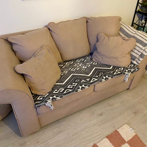 Tarjolla hyväkuntoinen ja ryhdikäs kolmen hengen sohva. Kangas hyvässä kunnossa, ei kulumia, tahroja taikka rispaumia. Istuin ja selkäosat myös kunnossa, ei painaumia yhdessäkään tyynyssä. Jalkoina kapeat metallijalat, helppo imuroida sohvan alta. Selkäosan tyynynpäälliset irrotettavat ja pestävät. Sohva juuri imuroitu ja pesty kangaspesurilla, ei hajuja tai muuta. Ei lemmikkejä taloudessa.