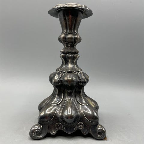 Kynnttilänjalka on alpakkaa eli uushopeaa ja on puhdistettu vain soodalla. Pinnassa kulumaa ja tummentumaa. Korkeus n.18cm