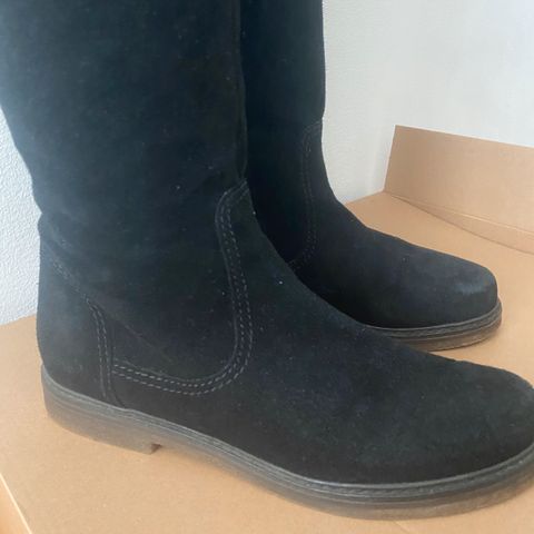 Ihanat, mustat nilkka saapikkaat, mocca pinta, varressa harmaa karva reunus. Sisäosassa ruudullinen villavuori, Käyttö jäi vain kokeiluksi jalka vaivan vuoksi.