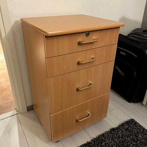 Erittäin hyväkuntoinen lipasto. Pyörät alla. Kolme laatikkoa, alin isompi. Liikkuu moitteettomasti.