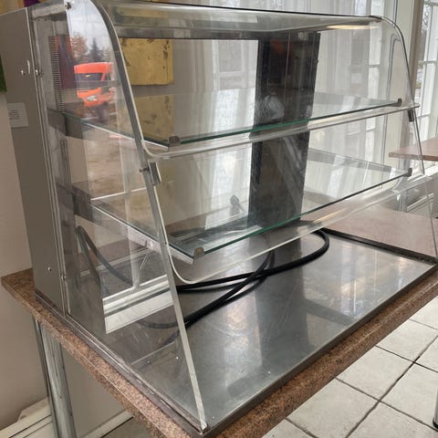 Lasivitriini, jossa on useita hyllyjä ja laatikoita. Pöytä soveltuu erilaiseen säilytykseen.