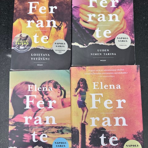 Elena Ferrante romaanit neljä osaa, sisältäen teokset My Brilliant Friend, The Story of a New Name, Those Who Leave and Those Who Stay sekä The Story of the Lost Child. Kirjasarjan teokset ovat englanninkielisiä ja ne ovat pehmeäkantisia. Ostettu uutena. Kaikki yht 10€.