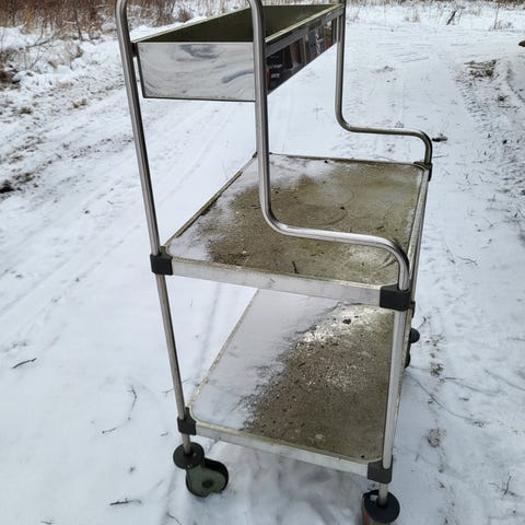 Tarjoilukärry, jossa musta metallirunko ja kaksi puupintaista tasoa. Varustettu pyörillä, jotka helpottavat liikuttelua. Soveltuu tarjoiluun ja säilytykseen. Ollut käytössä "baarikärrynä".