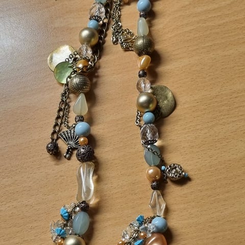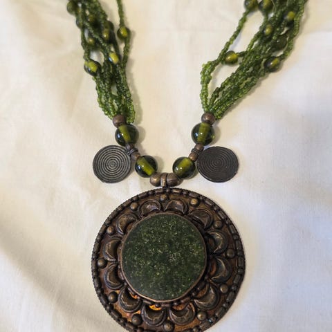 Vintage-tyylinen kaulakoru, jossa punaisia lasi- ja mustia komposiittikivihelmiä.