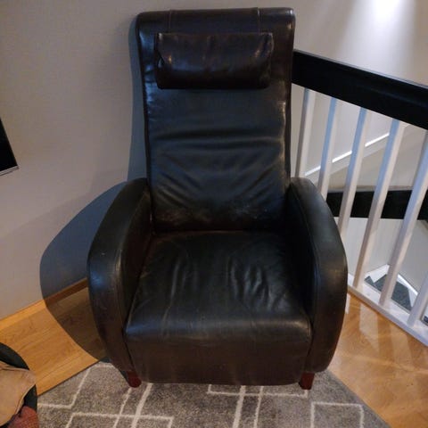 Ylimääräisenä valkoinen nahka nojatuoli.