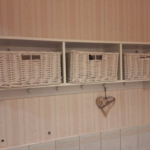 Näppärä kaunis korihylly, jossa on kaksi isohkoa koria tavaroiden säilytykseen. Vakaa ja pysyy hyvin pystyssä.