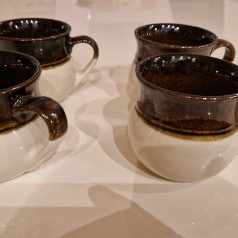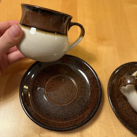 Kermansaven 6 kpl kahvikupit ja 8kpl tassit, joissa ruskeat ja valkoiset värit.
