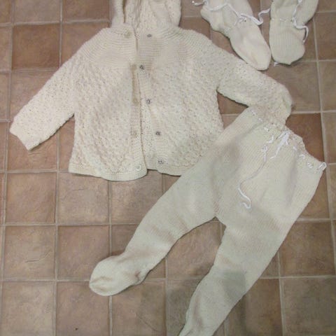 Nämä on alunperin tätini minulle 90-luvulla neulomat vaatteet. Ne löytyivät valitettavasti vasta omien lasteni kasvettua jo liian isoiksi, niin eivät heillekään ehtineet käyttöön. Säilytetty huolellisesti sisätiloissa.