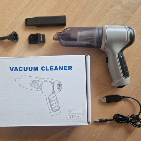 Tehokas 12V auton käsipölynimuri joustavalla letkulla, täydellinen auton siivoukseen.