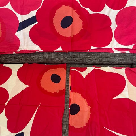 Ostan hyväkuntoisen Marimekon unikko pussilakanan ja tyynyliinan värissä vaaleanpunainen ja kulta. Mulle saa hintaa tarjota :)