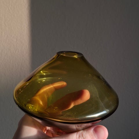 Kaksi Pentikin lasimaljakkoa. Korkeudet n. 24 cm ja n. 10 cm.
