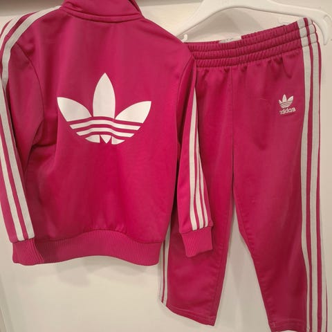 Adidas vaaleanpunainen verkkariasu. Materiaali polyesteri. Sisältää vetoketjullisen takin ja housut. Kokomerkintä 18-24 months ( ostettu ulkomailta) mutta vertasin niin noin kokoa 98 cm vastaavat. Kesällä käytetty takkina. Erittäin mieluinen vaate ollut neidille eli on käytetty ahkerasti yhdellä tytöllä mutta ihan käyttökelpoinen edelleen ja laadukas asu!