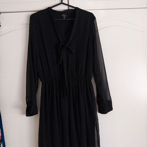 Myydään pilkullinen mekko. Merkki Esmara, mustia pilkkuja valkoisella pohjalla. Kaulalla rusetille solmittava nauha. Hyvässä kunnossa. Koko 38