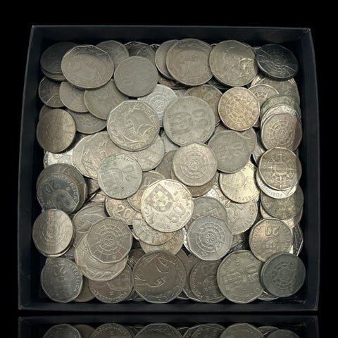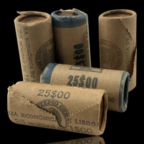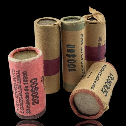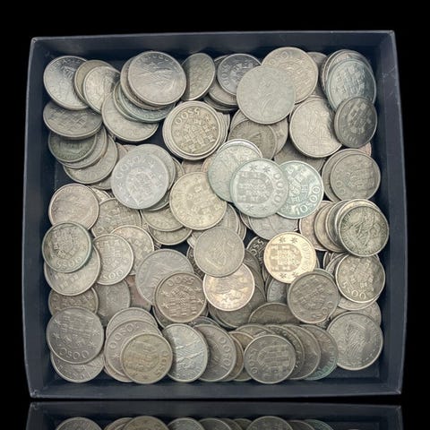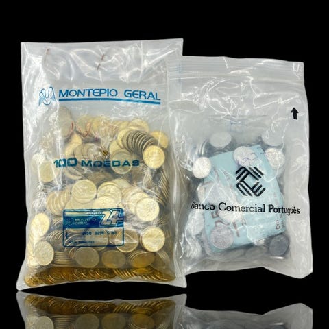 Portugali. 2 pussia pankin kolikoita käyttämättömiä 1 escudo 1987 ja 10 escudo 1986 (noin 300 kolikkoa) 1986–1987 (ilman varaushintaa)