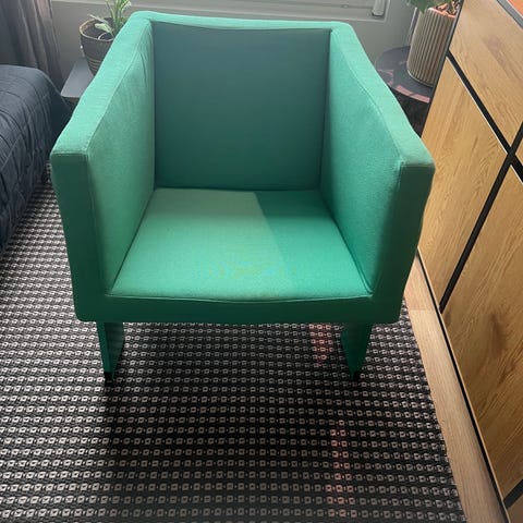 Tuoli on hyvässä kunnossa, mutta siinä on pieniä käytön jälkiä. Kangas on ehjä ja jalka tukevasti kiinni.