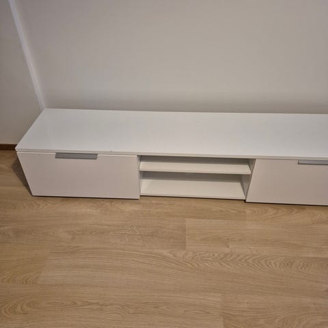 Noin vuoden vanha, hyvässä kunnossa oleva, valkoinen korkeakiiltoinen tv-taso. Nopeilla kaupoilla pois uuden tieltä.