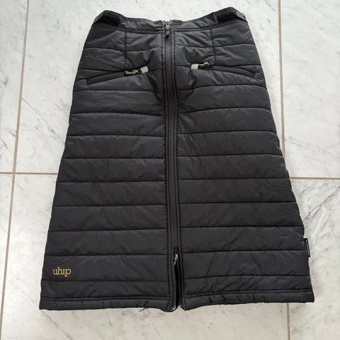 Musta toppahame, jossa etupuolella kaksisuuntainen vetoketju ja takana vetoketjuhalkio ylös. Vyötäröllä leveä pehmeä ja todella joustava resori eli kiva pitää päällä takin alla.