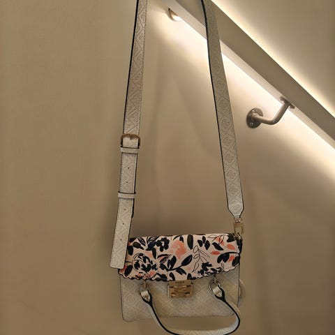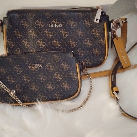 Uudenveroinen Guess laukku. Rannehihna. Vetoketju. Sisällä 4 pikkutaskua, joista yhdessä vetoketju. Koko 28x20cm. Mukana säilytyspussi. Savuton ja eläimetön talous.