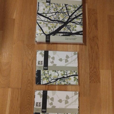 Hyväkuntoinen pussilakanasetti. Vallila Pihapuut taitaa olla kuosi. Tämä ollut aikuisille vieraspedeissä käytössä, eli vain 2-3 yksittäistä käyttökertaa. Erittäin hyväkuntoinen. Kuosia ei valmisteta enää. Tyynyliina ja pussilakana yhteensä 25€. Kevät kotiin ihanat värityksensä puolesta, kuin toisi juuri lehteen puhjenneet koivut sisään..