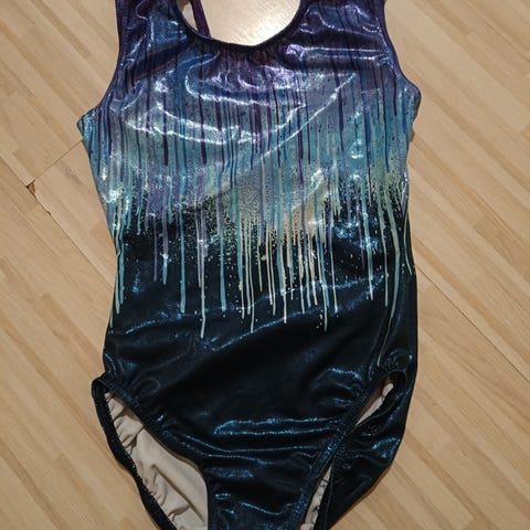 Lasten voimistelupuku koko 130-140cm väriltään valkoinen ja sininen. Materiaalina joustava kangas, jossa koristeena läpinäkyvää kangasta ja koristekiviä lumihiutalekuvion muodossa. Sopii myös tanssiin ja balettiin.