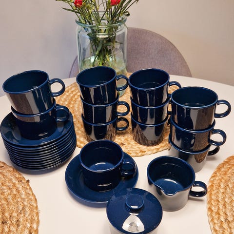 Iittala/ arabia teema kahvikupit ja lautaset.