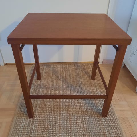 Sivupöytä 50-60 luvulta. Tiikki/ koivu & mosaiikki. Mosaiikin saumoissa tummentumaa paikoin.