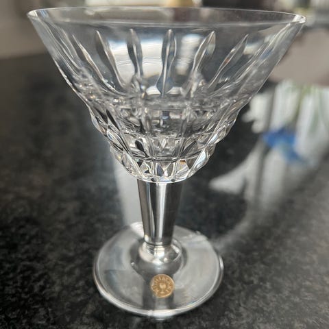 Aimo Okkolin suunnitteli Riihimäen Lasille 1960 luvulla tämän kauniin Polar-nimisen kristallilasi malliston. Tämä myynnissä oleva lasi on ns, grogi- tai olutlasi. Lasin korkeus on 14cm ja suuaukko 7cm. Laseja on kaikkiaan 12 kpl ja mahdollisuus ostaa ne kaikki. Lasit virheettömiä ja naarmuttomia.