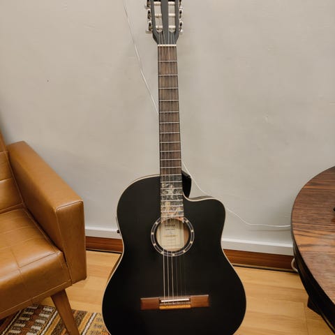 Salvador Ibanez elektroakustinen kitara, vaaleanruskea. Kitara on puoliakustinen ja varustettu Ibanezin AEQ-200T esivahvistimella, jossa on viritin sekä basson ja diskantin säätömahdollisuudet.