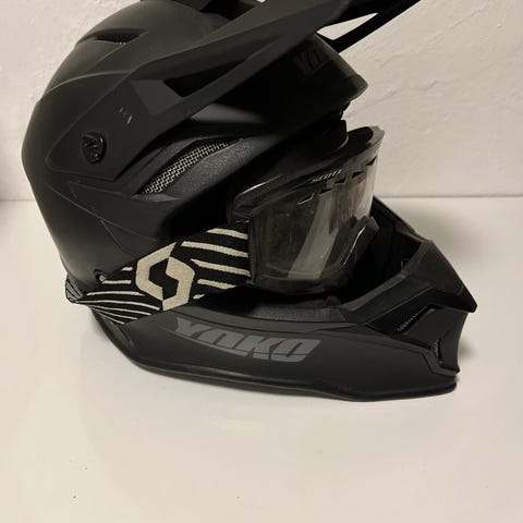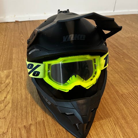Yoko kypärä mattamusta väri, motocross-tyylinen kypärä. Kypärä tarjoaa suojaa ja pehmustetun sisäosan mukavuutta varten. Koko n. S. Lisänä mukaan 100%-merkkiset säädettävät punaiset ajolasit, jotka sopivat kypärään.