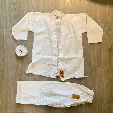 Seuraavalle harrastajalle hyväkuntoinen karatepuku 130 cm. Vyöraidat voi purkaa halutessaan. Rintaan ommeltu Lahden karate-merkki. En postittele, mutta voin tuoda Lahden keskustaan.