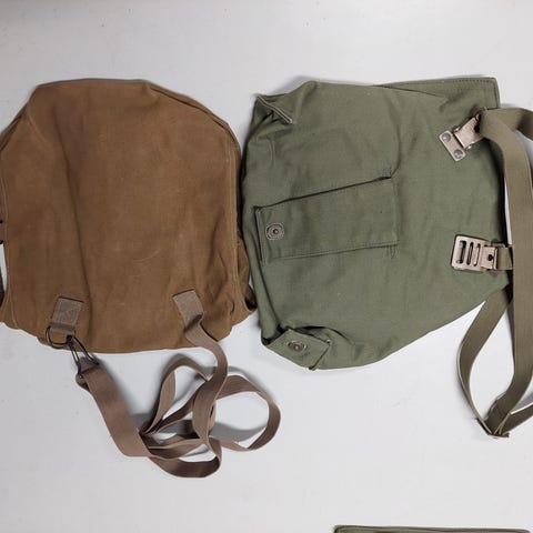 Lajitelma militaria tavaroita. Armeijan Laukku, tyhjiä latausharjoitus ammuksia, iso hylsy sisällissodan ajoilta ja patruunatasku.