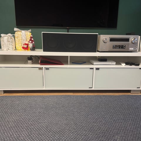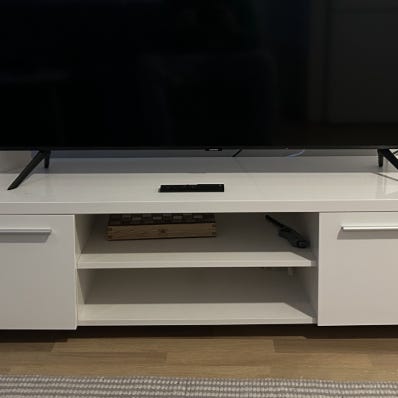 Jysk AakirkebyTV-taso, jossa on kaksi vetolaatikkoa ja avoin hyllytila keskellä. Valkoinen väri.