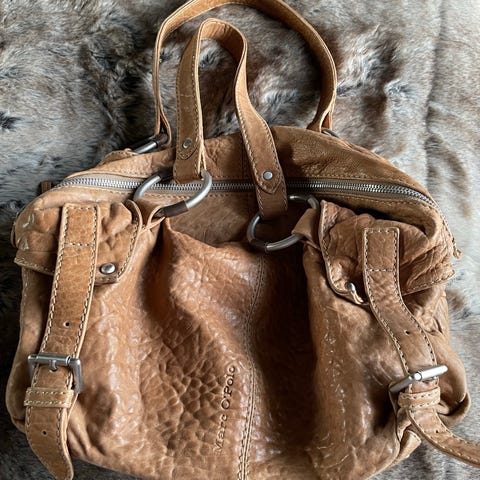Marc O'Polo nahkainen naisten laukku, jossa säädettävä olkahihna. Laukussa on vetoketjutasku ulkopuolella ja sisäpuolella. Materiaali on aitoa nahkaa. Koko n. 38x38cm.