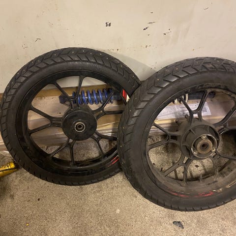 siitä jolleki riejun omat uuden vertaset vanteet 3,4tkm ajettu noilla ei näy käytön jälkiä laakerit pyörii hyvin ja pintaa on renkaissa jarrulevyt mukaan ilman bultteja Siitä vaan tulkaa tarjoilee vaihtoja ja rahallakin menee