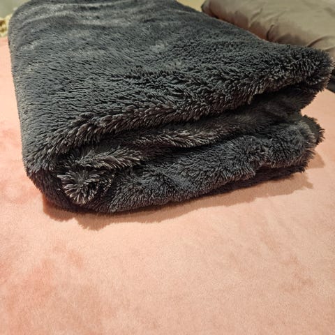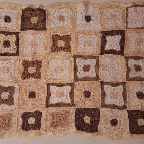 Sinivalkoinen Langø-merkin kaunis viltti. Oli pentukoiralle ja hänen hampaille aikoinaan mieleen ja siksi paikkailtu. Kuitenkin kaunis. Koko n. 135 x 135 cm.