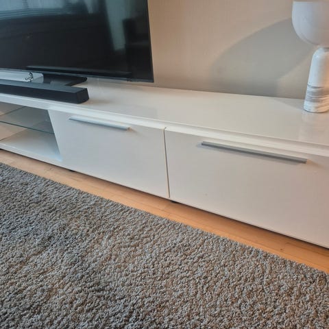 Hyväkuntoinen TV-taso/vetolaatikosto. Aurinko tummentanut pintaa esineiden ympärillä, kuten kuvassa näkyy. Valkoinen/koivu