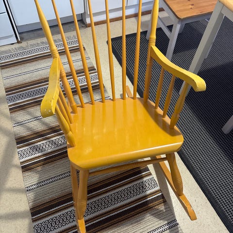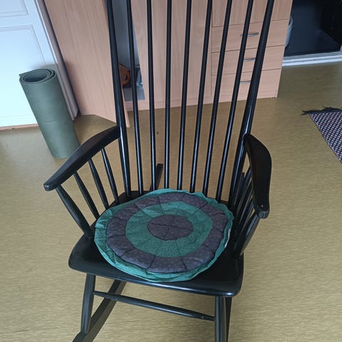 Myydän musta keinutuoli. Materiaali muovia ja jalat puuta. Joitakin käytön jälkiä löytyy. Vasemmalla puolen pieni naarmu.