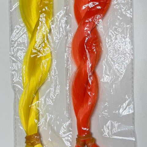 Yksi täysin käyttämätön ja kahdesta otettu muutamaan hius plogiin eli vajaa sentti käytetty kahdesta. Kirkkaat värit. Hiuksen pituus 30cm ja yhden nipun paino n 30g Materiaali nylon. MMM