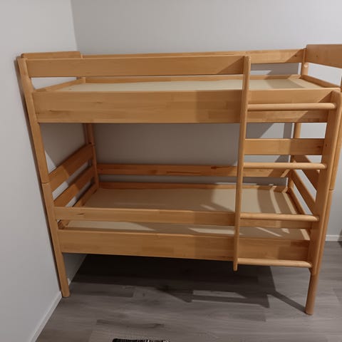Myydään tukeva lasten kerrossänky paikoin pientä kulumaa mutta ei isompaa.portaiden paikkaa voi vaihtaa joko päätyyn tai sivulle.